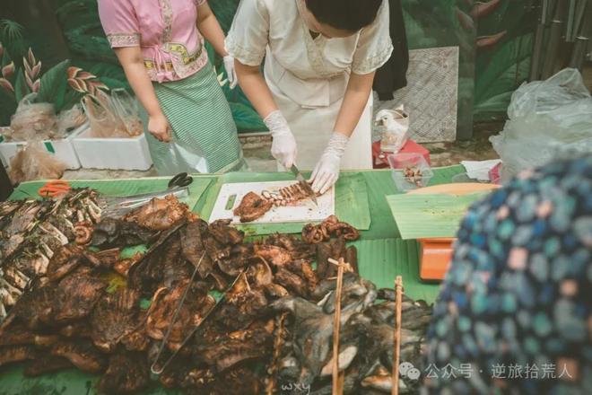 赶摆场上最吸引人的莫过于各式各样的傣家传统美食。石臼舂制的“喃咪”蘸料、芭蕉叶包裹的各类烧烤、时令水果制作的凉拌拼盘,浓郁的香气扑面而来,令人垂涎欲滴。